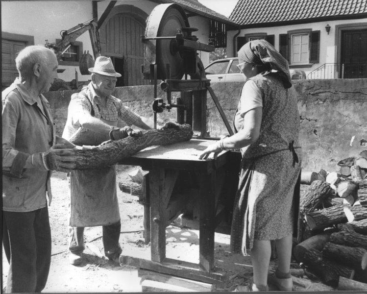 Klärchen und Ernst Weis (Gimsbach), Paul Kemmer (Pfeffelbach) beim Brennholzsägen; Anfang der 90er Jahre