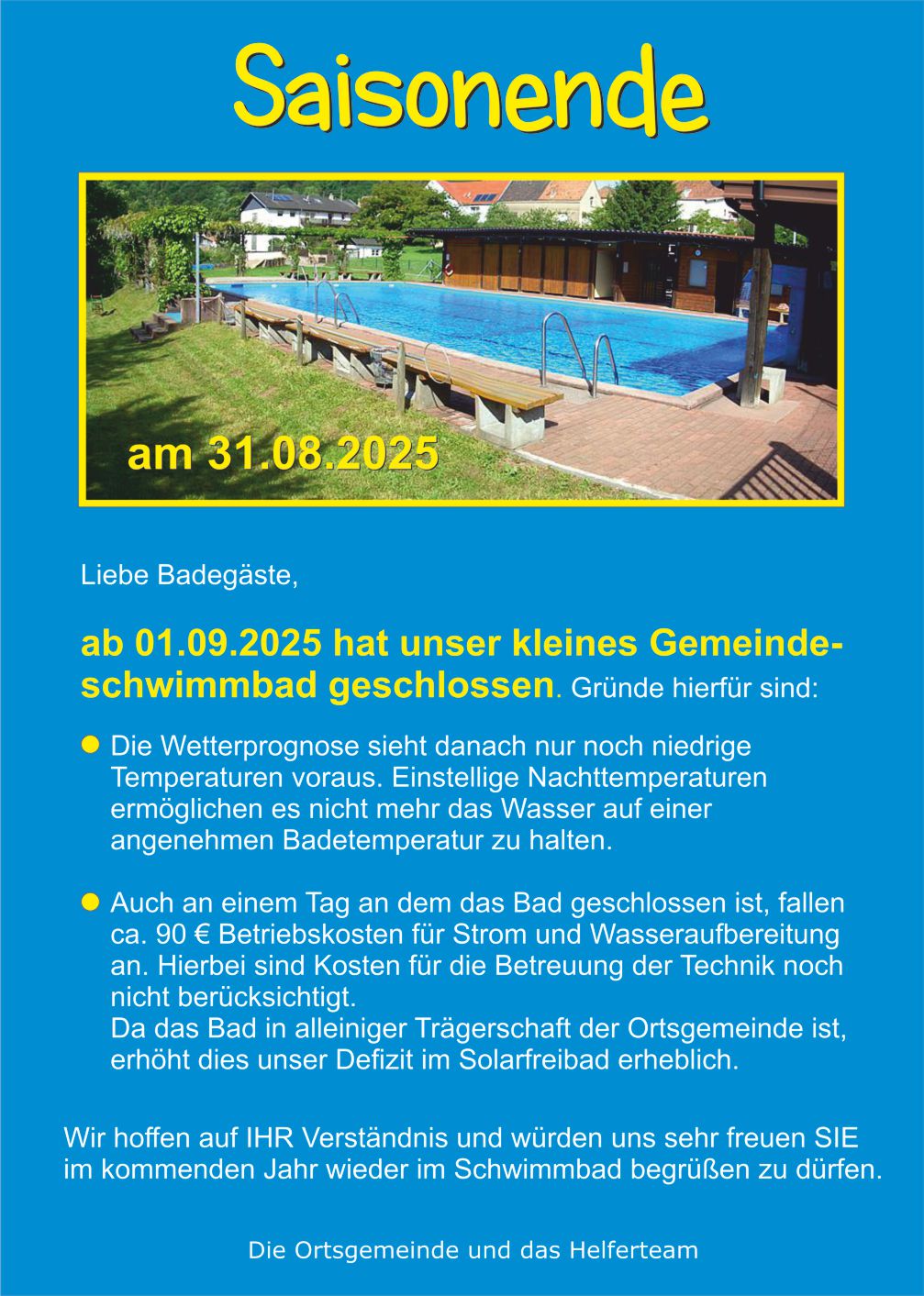 Die Badegäste werden gebeten, den Parkplatz neben der Kirche im Ortsteil Gimsbach zu benutzen und die Zufahrten für Rettungsdienste, sowie die privaten Hofflächen freizuhalten !