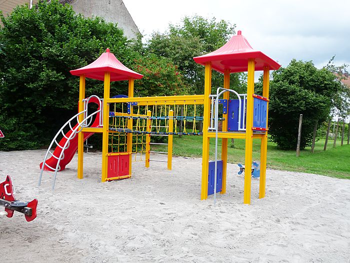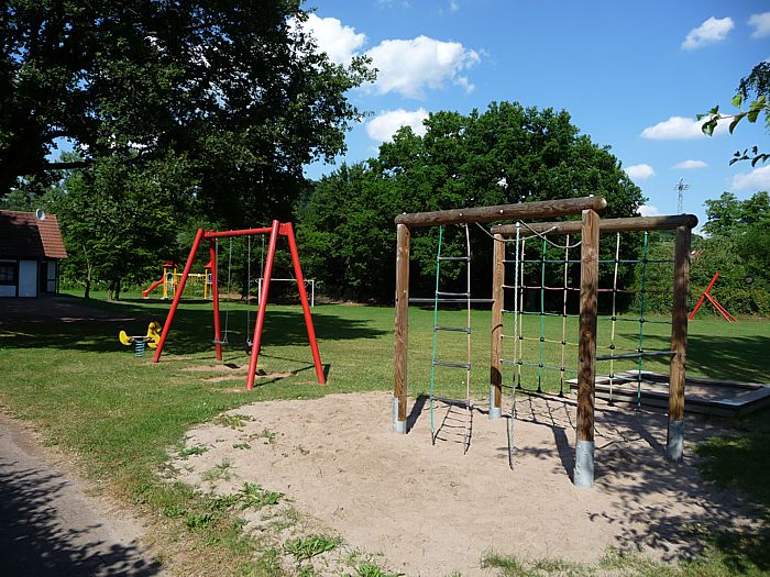 Klettergerüst, Doppelschaukel, Sandkasten, im Hintergrund das WC-Gebäude