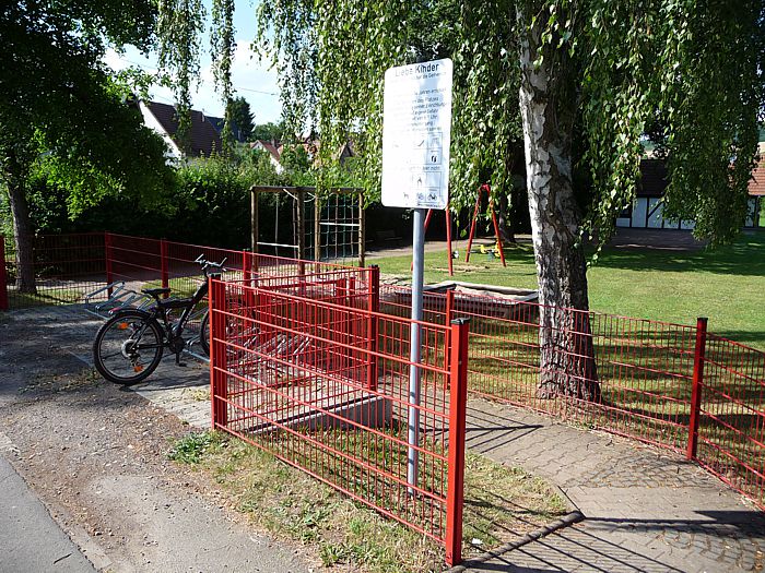 Der Zugang zum Spielplatz mit Hinweistafel und Fahrradständer